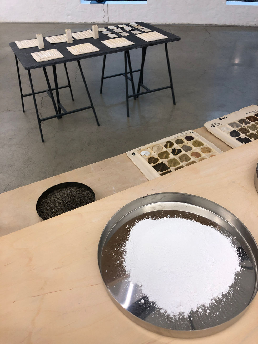 Exhibition of glaze tests and material samples by the MoW group, with ceramic reliefs by MA2 student Linda Flø. Artistic Research Week 2024 at Oslo National Academy of the Arts.