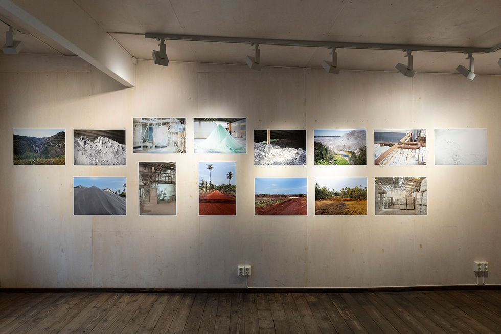 The exhibition consisted of four parts in which we displayed material tests on TiO2 in ceramic glazes, archive material, fieldwork photography by Marte Johnslien, artworks from our MA students Silje Kjørholt and Linda Flø, a site-specific work by affiliated artist Julia K. Persson, and a research installation by our guest researcher Kshitija Mruthyunjaya. In addition to an exhibition, the research team organized numerous public debates, artist talks, presentations, workshops, and collaboration meetings with our museum partners.